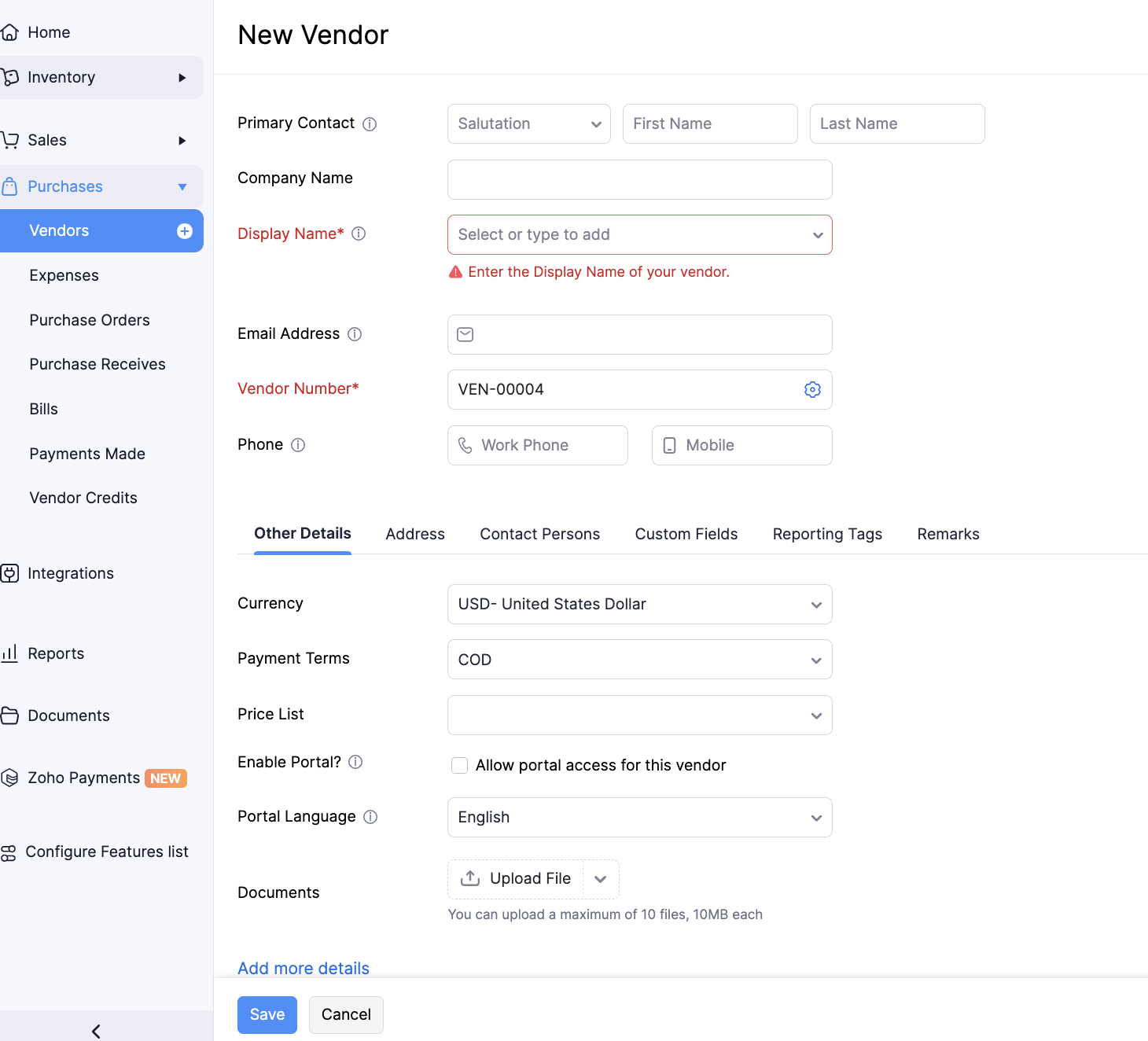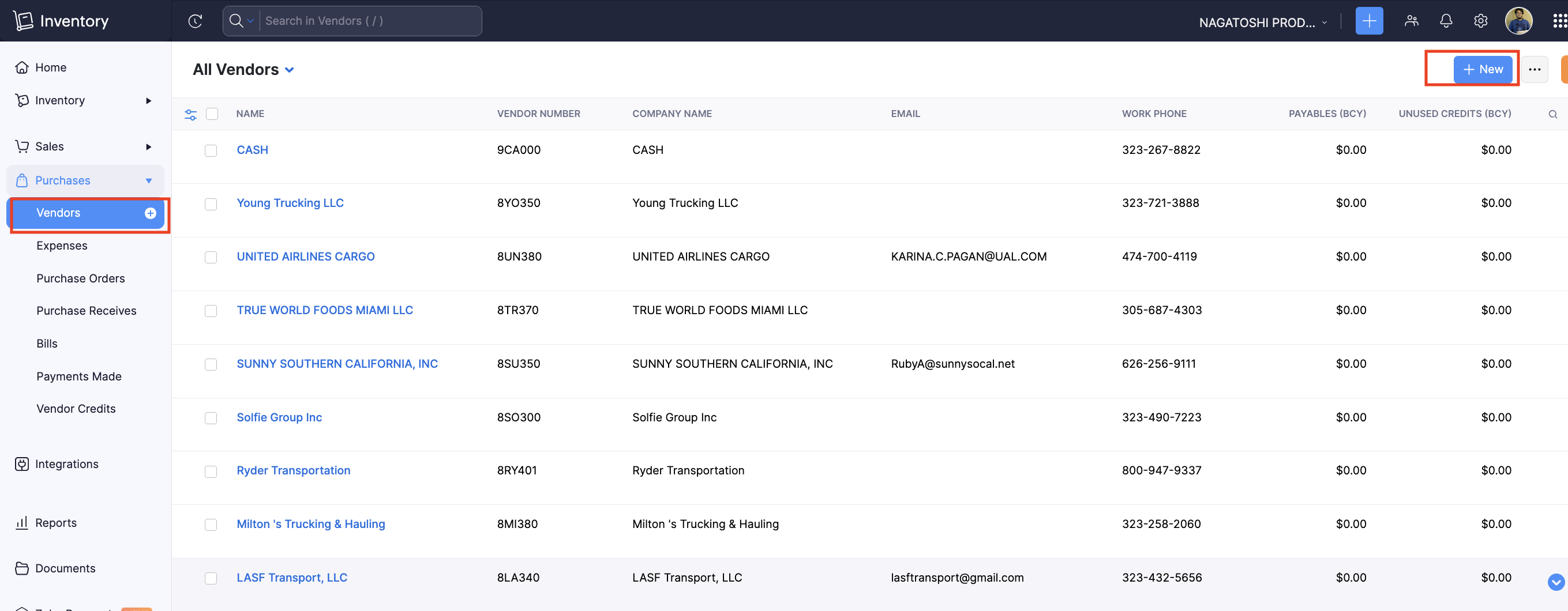 2. Click "+" icon near the Vendors title or "New" button not he top right side