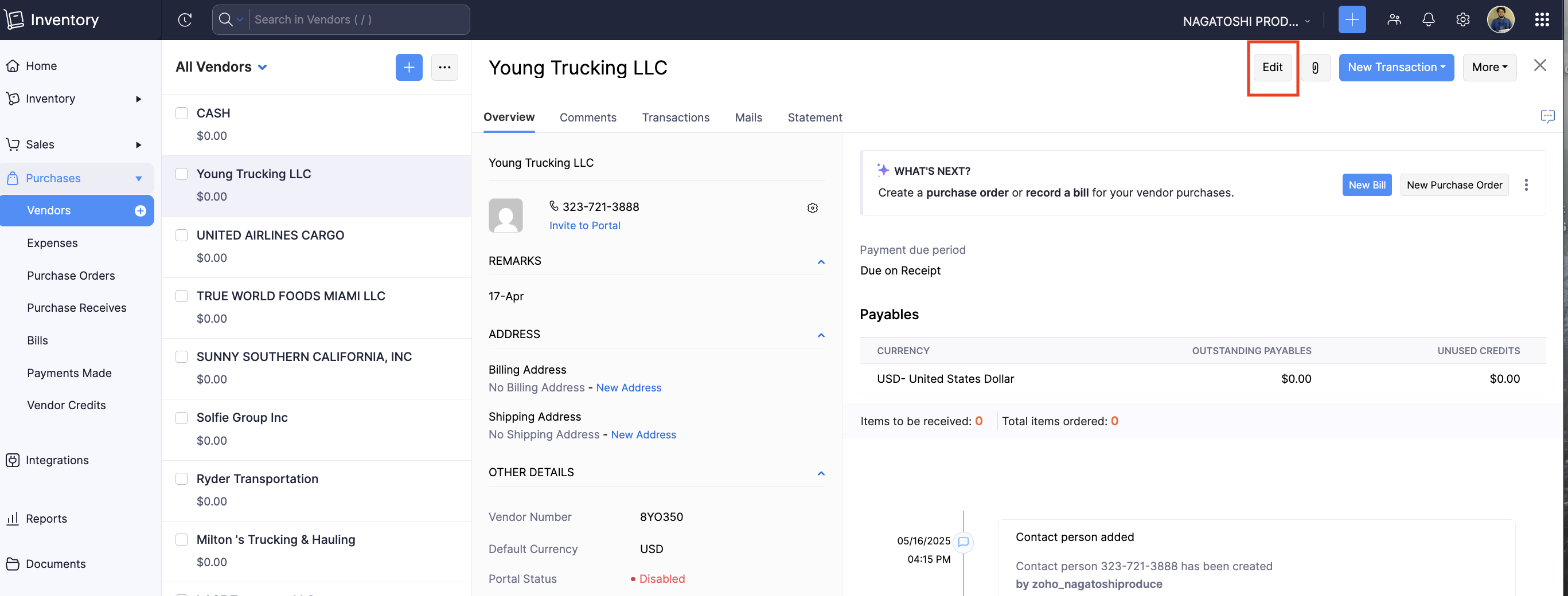 2. Select the vendor and click Edit button on the top right side. Edit and Save. The record will be updated and synced to Creator